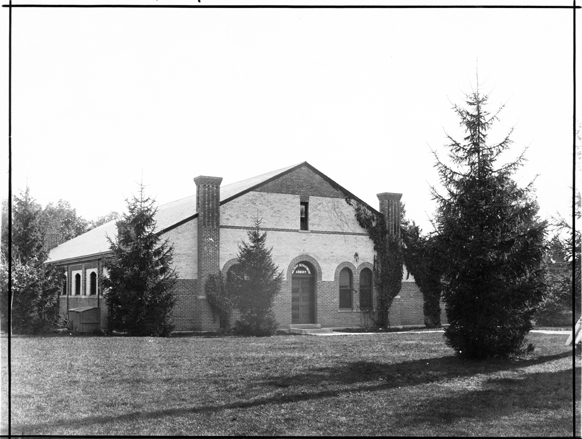 The photograph shows the front of the Armory building, circa 1900. Demonstration Hall was built to replace the Armory, and in 1939 the Armory was demolished.
