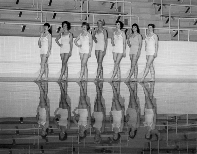 Seven members of the Green Splash swimming club pose in white bathing suits by the side of the pool. Their reflections can be seen clearly.