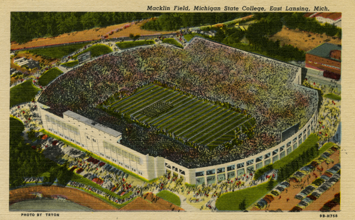 This photograph shows an aerial view of the Michigan State Stadium. The text on the front reads: "Macklin Field, Michigan State College, East Lansing, Mich."