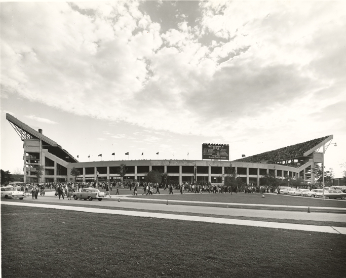 This photograph shows visitors walking to and from Spartan Stadium. The "Schedule 1958" board can be seen from afar.