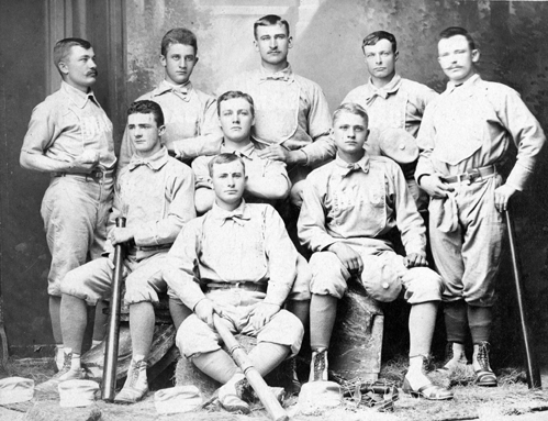 This photograph shows the Michigan Agricultural College baseball team in the 1880s. The text on the back reads: "Given in 1955 by daughter of Vance (pitcher)."